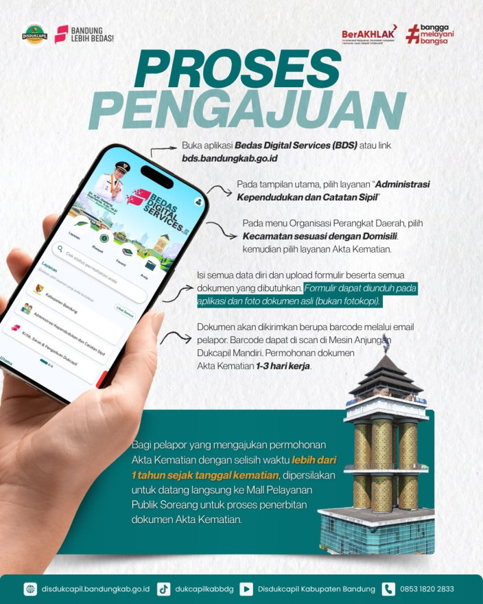 Catatan Penting: > Jika pelaporan kematian dilakukan lebih dari 1 tahun sejak tanggal kematian, pelapor diwajibkan datang langsung ke Mall Pelayanan Publik (MPP) Soreang untuk proses penerbitan.