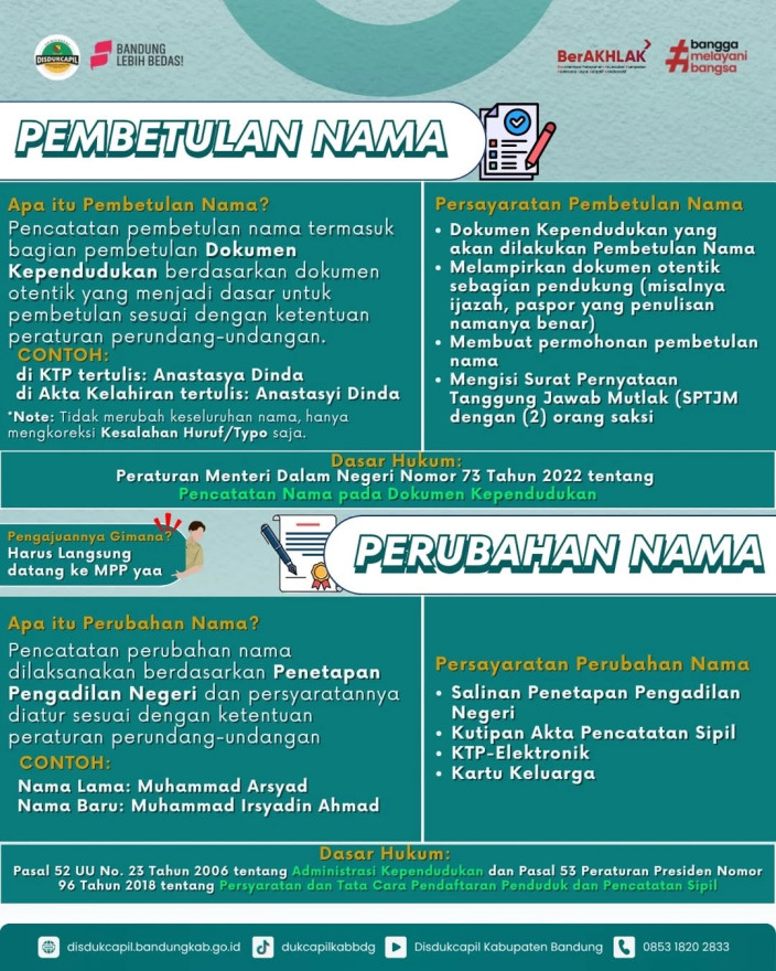 Bagi warga Kabupaten Bandung, pengajuan baik Pembetulan maupun Perubahan Nama dilakukan dengan cara datang langsung ke Mall Pelayanan Publik (MPP). Pastikan Anda telah membawa seluruh dokumen persyaratan dalam bentuk asli untuk diverifikasi oleh petugas.