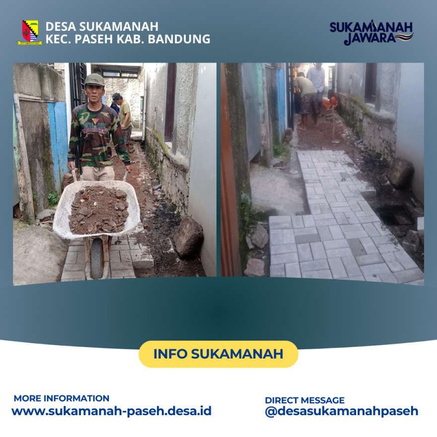 INFO-SUKAMANAH. Dalam upaya meningkatkan aksesibilitas dan kenyamanan warga, Desa Sukamanah, Kecamatan Paseh, melaksanakan kegiatan pembangunan berupa pemasangan paving blok di jalan gang wilayah RW.01 RT.01. Kegiatan ini merupakan bagian dari komitmen pemerintah desa dalam memperbaiki infrastruktur lingkungan bagi masyarakat. Pemasangan paving blok ini didanai melalui anggaran Musrenbang tahun 2024, yang direalisasikan pada tahun 2025. Sumber dana utama berasal dari Dinas Perumahan, Kawasan Permukiman, dan Pertanahan Kabupaten Bandung, ditambah dengan swadaya masyarakat setempat, menunjukkan semangat gotong royong yang terus hidup di Desa Sukamanah. Adapun volume pekerjaan meliputi pemasangan paving blok seluas 200 m² yang dibiayai dari Musrenbang, serta tambahan 8 m² hasil dari swadaya masyarakat. Dengan pembangunan ini, diharapkan mobilitas warga menjadi lebih lancar, lingkungan lebih bersih, serta nilai estetika wilayah meningkat. Kepala Desa Sukamanah menyampaikan rasa terima kasih kepada seluruh pihak yang telah mendukung, terutama warga RW.01 RT.01 yang turut bergotong-royong demi suksesnya pembangunan ini. Semangat kolaborasi ini diharapkan terus terjaga untuk mewujudkan Desa Sukamanah yang lebih maju dan sejahtera.