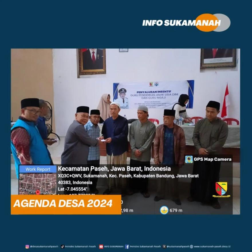 Jumat, 18 Oktober 2024. Pemerintah Desa Sukamanah, Kecamatan Paseh, melaksanakan kegiatan penyaluran insentif bagi para guru PAUD dan guru ngaji. Acara ini dimulai tepat pada pukul 08.30 WIB dan berlangsung di aula Kantor Desa Sukamanah Kecamatan Paseh. Kegiatan ini merupakan bagian dari komitmen pemerintah dalam memberikan apresiasi dan dukungan kepada para tenaga pendidik yang telah berperan penting dalam mencerdaskan anak-anak usia dini serta membimbing generasi muda dalam aspek keagamaan. Insentif yang diberikan merupakan bagian dari alokasi anggaran yang bersumber dari Dana Desa Tahap 2 Tahun 2024 yang telah direncanakan untuk mendukung kesejahteraan mereka.