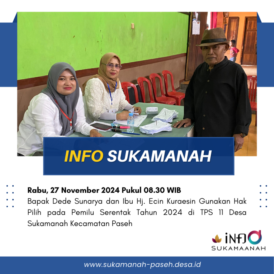 Sukamanah, 27 November 2024 – Kepala Desa Sukamanah, Bapak Dede Sunarya, bersama Ibu Hj. Ecin Kuraesin selaku Ketua TP PKK Desa Sukamanah, turut menggunakan hak pilihnya dalam Pemilihan Gubernur dan Wakil Gubernur Provinsi Jawa Barat serta Pemilihan Bupati dan Wakil Bupati Kabupaten Bandung. Keduanya hadir di Tempat Pemungutan Suara (TPS) 11, Desa Sukamanah, Kecamatan Paseh, pada pukul 08.30 WIB pagi ini. Dengan penuh semangat, Bapak Dede Sunarya dan Ibu Hj. Ecin Kuraesin tampak hadir sebagai bentuk partisipasi aktif dalam mendukung terselenggaranya demokrasi yang jujur dan adil. Keduanya memberikan contoh kepada masyarakat untuk menggunakan hak pilih dengan bijaksana. “Saya mengajak seluruh warga Desa Sukamanah untuk menggunakan hak pilihnya. Suara kita sangat berharga dalam menentukan masa depan daerah dan provinsi kita,” ujar Bapak Dede Sunarya saat ditemui setelah proses pencoblosan.