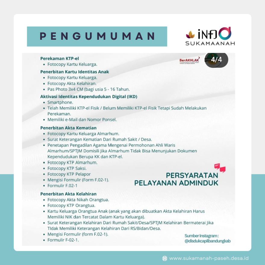 INFO-SUKAMANAH. Diberitahukan Kepada Seluruh Warga Desa Sukamanah Kecamatan Paseh Berikut adalah Jadwal Pelayanan Mobile Desa Administrasi Kependudukan yang akan dilaksanakan pada :